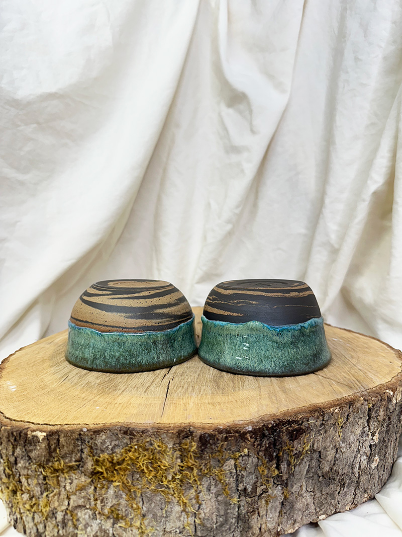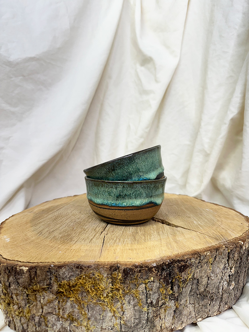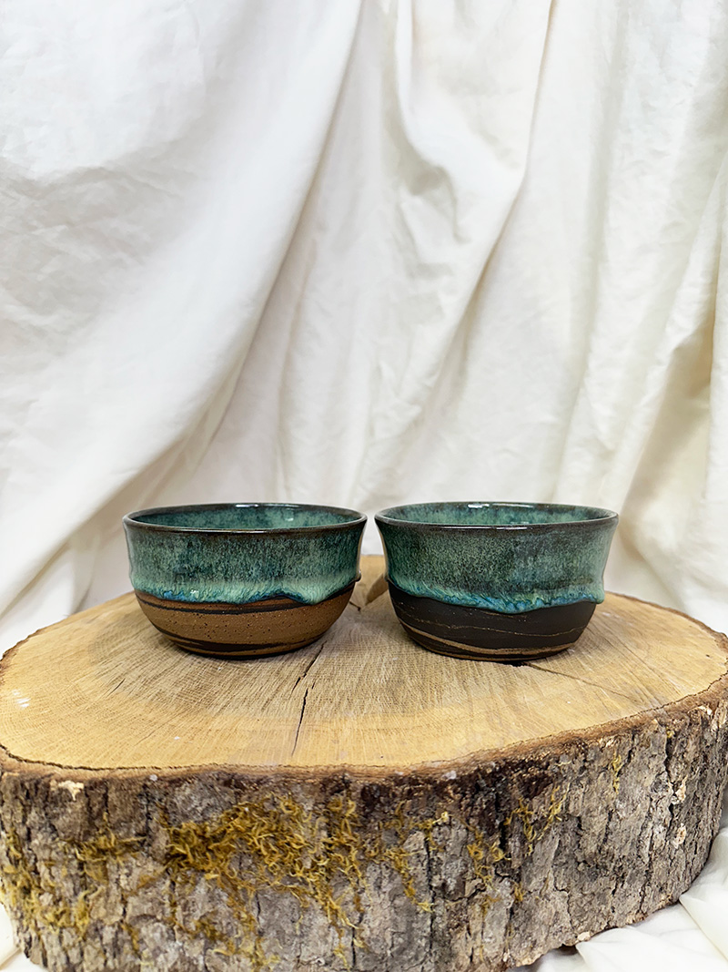 Handmade pottery, wheel-thrown mug. Two small bowls included (each bowl is approximately 7.4-7.9 ounces). Size: (both approx) 4.25″ x 2.25″