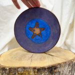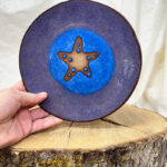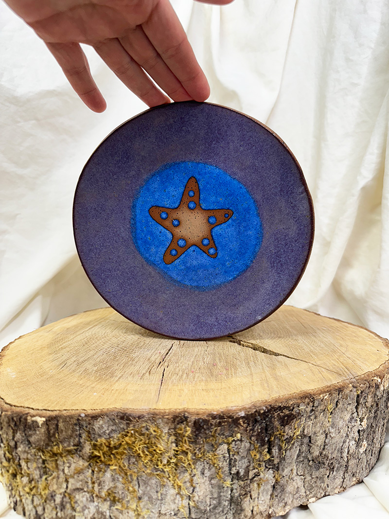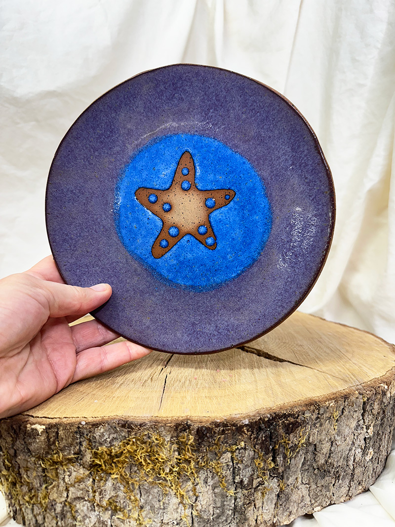 Handbuilt slab plate with starfish. This has bare clay exposed so either decoration or a cracker plate 🙂
